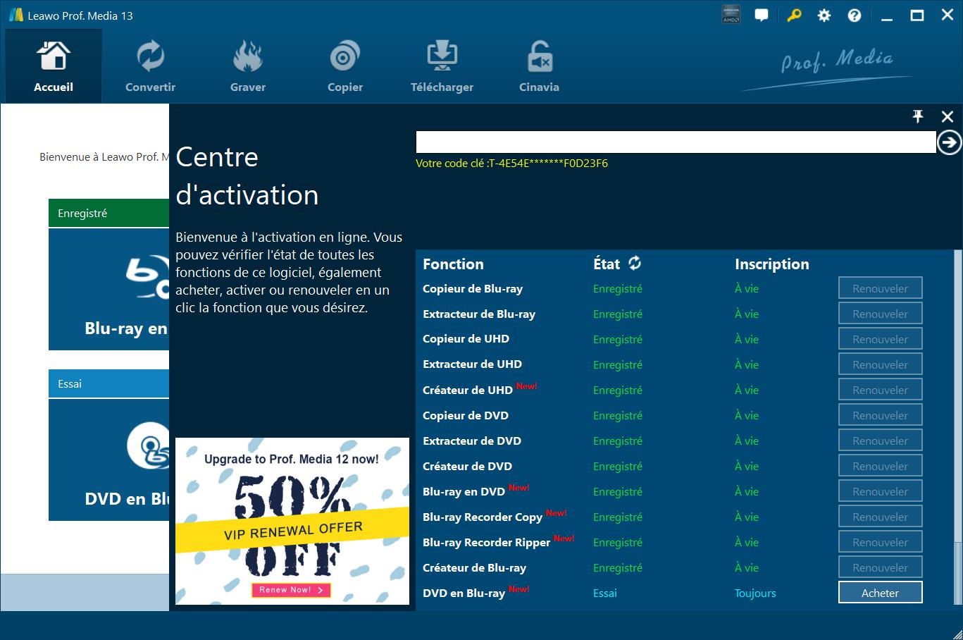 Pour activer le module Convertisseur de DVD en Blu-ray de Leawo, démarrez Prof. Media de Leawo sur votre ordinateur, puis cliquez sur l'icône « Centre d'Activation » pour appeler l'interface « Centre d'Activation ». Ensuite, copiez la licence depuis votre boîte email et collez-la dans la barre vide de l'interface du « Centre d'activation » avant de cliquer sur l'icône « Enregistrer »