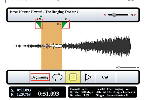 Étape 2 : Sélectionnez le clip que vous voulez couper en faisant glisser l'icône verte en forme de triangle inversé. Vous pouvez cliquer sur « Début » pour faire démarrer la chanson à partir de la position gauche de l'icône verte.