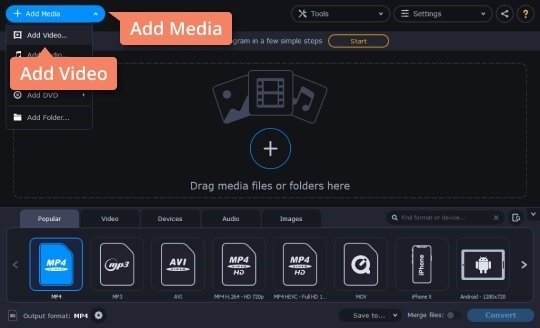 Sur l'interface principale de Movavi Video Converter, cliquez sur le bouton « Ajouter un média » dans le coin en haut à gauche et sélectionnez l'option « Ajouter une vidéo » pour importer les fichiers vidéo WMV sources dans le programme.