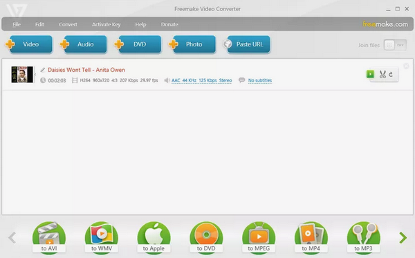 Bien que le Convertisseur de Vidéo de Leawo soit un excellent choix pour la conversion de MP4 à WAV, ce n'est certainement pas la seule option. Vous pouvez choisir parmi de nombreuses applications similaires, par exemple Freemake Video Converter. Il est un outil de traitement vidéo d'entrée de gamme développé par Ellora Assets Corporation. Le programme est couramment utilisé pour extraire des DVD non protégés, créer des diaporamas photo, graver des DVD et convertir des formats vidéo de base. Non seulement il peut convertir des fichiers vidéo et audio, mais il se spécialise également dans les fonctions de montage vidéo non linéaire et peut effectuer des tâches telles que couper, faire pivoter, retourner et fusionner plusieurs vidéos en un seul fichier avec des effets de transition. En ce qui concerne la conversion de média, Freemake Video Converter peut fournir une fonction de conversion de base, mais peu d'options de personnalisation avancées sont proposées. Il est un programme freemium, ce qui signifie que certaines des fonctionnalités impressionnantes ne sont pas disponibles dans la version gratuite. Donc, si vous voulez avoir toutes les fonctions de ce logiciel, vous devez encore dépenser de l'argent. Pour convertir MP4 en WAV avec Freemake Video Converter, suivez simplement le guide étape par étape ci-dessous.
