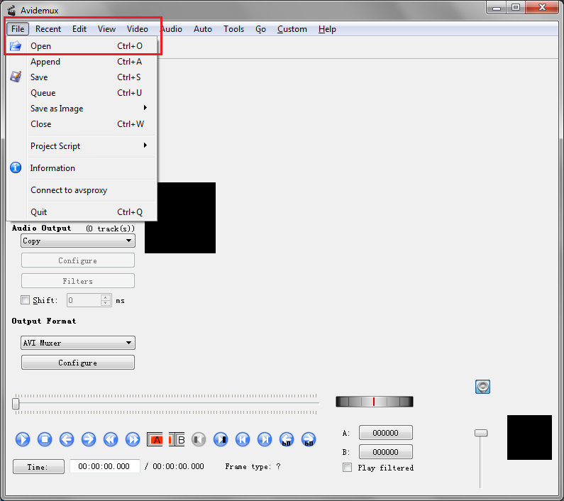 Étape 2. Lancez Avidemux. Cliquez sur l'onglet « Fichier » dans le menu du programme et sélectionnez « Ouvrir » pour ouvrir le fichier extrait.