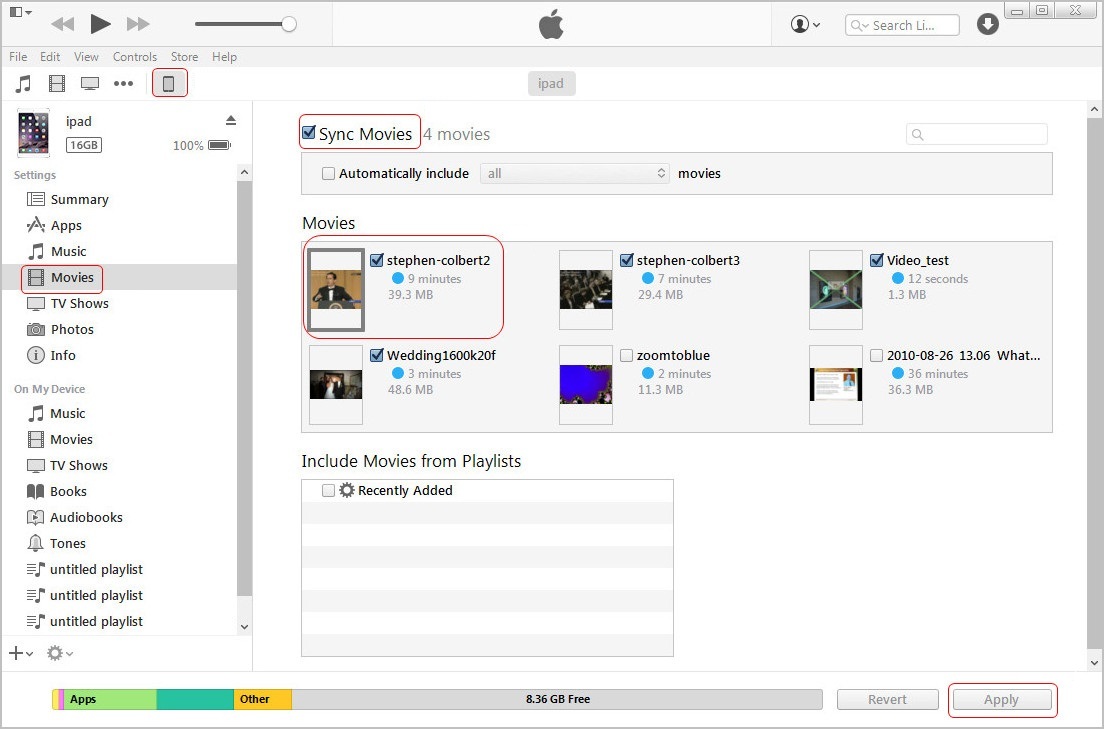 Étape 3. Cliquez sur le bouton Appliquer dans iTunes. Puis, les vidéos sélectionnées seront synchronisées sur votre iPad.