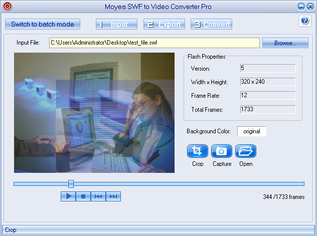 Étape 4 : Après avoir chargé le fichier SWF, vous pouvez prévisualiser la vidéo dans le programme. Aussi, vous pouvez recadrer ou capturer l'écran lors de la prévisualisation. Vous pouvez voir les propriétés de la vidéo actuelle comme la version, la largeur/hauteur, les images par seconde et le nombre total d'images à droite.