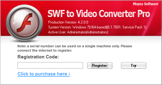 Étape 2 : Lancez Moyea SWF to Video Converter Pro. Pour la première fois que vous utilisez le programme, vous devez entrer votre code de registre. Si vous n'en avez pas, cliquez sur « Essayer » pour utiliser l'essai gratuit du programme.