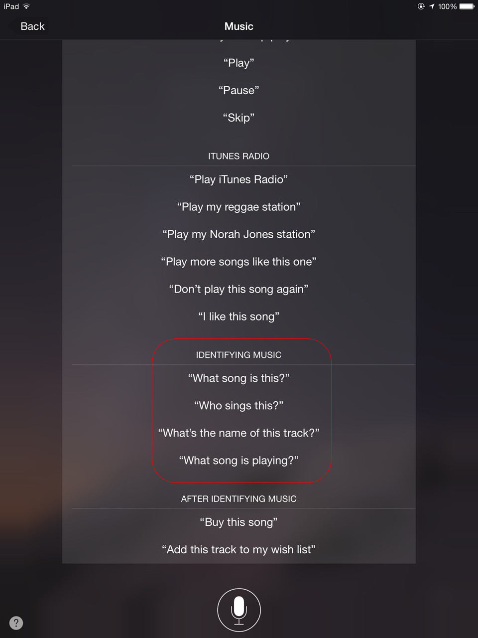 Lorsque les gens veulent comprendre les informations précises d'une chanson, ils peuvent demander de l'aide à Siri. Les utilisateurs ont juste besoin d'ouvrir Siri sur leur iPad et de demander « quelle chanson est-ce » ou « ce qui est en cours de lecture ». Siri écoutera brièvement la mélodie puis donnera les informations de la chanson.