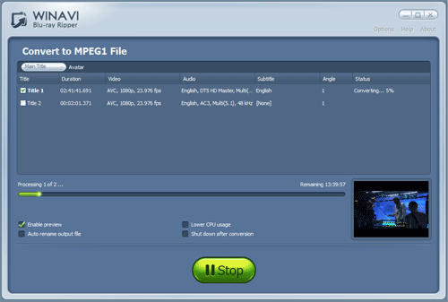 L'Extracteur de Blu-ray de WinAVI fonctionne bien comme un convertisseur MPEG Blu-ray pour sortir des fichiers MPEG en MPEG-1 ou MPEG-2. Téléchargez et installez le Convertisseur de Blu-ray en MPEG de WinAVI gratuitement et commencez à convertir Blu-ray en MPEG.