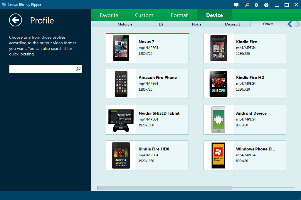 L'Extracteur de Blu-ray de Leawo est un convertisseur efficace de Blu-ray en vidéo qui peut convertir les films Blu-ray d'un disque ou d'un dossier en vidéos de divers formats pour différents usages. Il pourrait servir d'un convertisseur de Blu-ray en Google Nexus 7 pour vous aider à facilement convertir Blu-ray en vidéos compatibles avec Google Nexus 7 et ainsi vous permettre de regarder librement les films Blu-ray sur la tablette Google Nexus 7 n'importe quand et n'importe où. Le plus étonnant, c'est qu'il fournit même aux utilisateurs le Nexus 7 comme dispositif de sortie direct, ce qui permet aux utilisateurs de gagner beaucoup de temps et d'énergie pour préciser le format et les paramètres de sortie. Suivez les étapes détaillées ci-dessous pour savoir comment convertir Blu-ray en tablette Nexus 7 avec l'Extracteur de Blu-ray de Leawo.