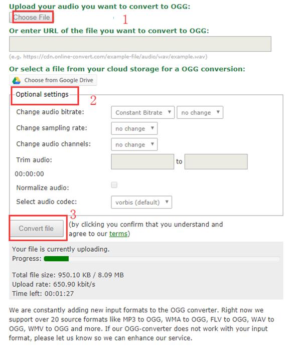 Étape 3 : Cliquez sur le bouton « Choisir un fichier » dans la page Web et ajoutez le fichier MP3 converti dans le convertisseur en ligne. Ensuite, vous pouvez utiliser la fonction « Paramètres facultatifs » pour définir les informations détaillées des fichiers de sortie. Enfin, vous pouvez cliquer sur le bouton « Convertir le fichier » pour commencer à convertir MP3 sans DRM en OGG.