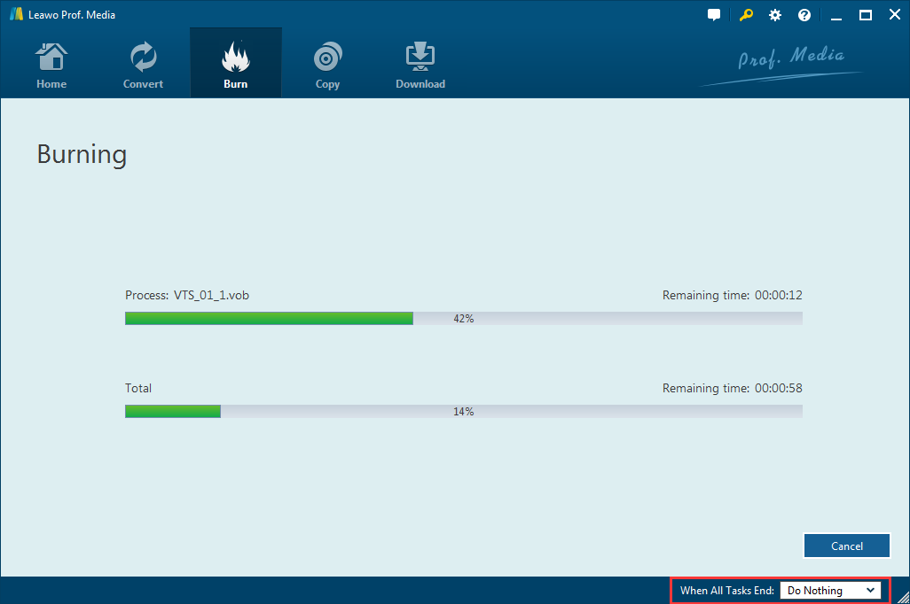 Enfin, cliquez sur l'icône « Graver » située en bas pour commencer à graver les fichiers H.264 sur DVD. Le processus de gravure peut coûter de quelques minutes à plusieurs heures selon la taille des fichiers que vous gravez. Vous pouvez prédéfinir le comportement du système après la finition sans attendre qu'il se termine.
