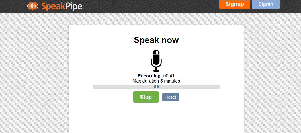 SpeakPipe est une application d'enregistrement vocal en ligne gratuite. Il vous permet d'enregistrer la voix du microphone en un seul clic. Puis, le fichier audio sera téléchargé sur le serveur SpeakPipe. Vous pouvez télécharger le fichier MP3 ou le partager directement avec les autres à l'aide d'un lien URL. Vous pouvez vous connecter à ce système pour conserver les enregistrements audio dans votre compte.