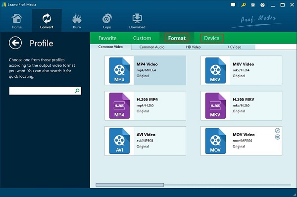 Ou vous pouvez choisir l'option «Format» ou «Appareil», ou rechercher le profil souhaité avec un accès rapide via la barre de recherche.