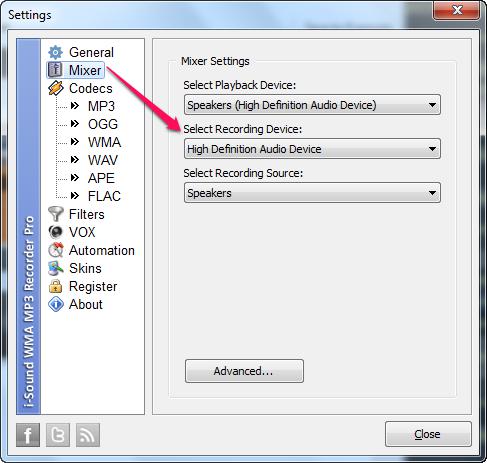 Cliquez sur Mixer (« Mélangeur »), puis sélectionne le périphérique d'enregistrement en tant que périphérique de carte son de votre système, afin que l'enregistreur puisse enregistrer le son à partir du PC.
