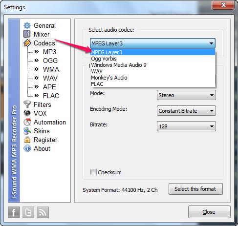 Cliquez sur « Codecs », puis sélectionnez votre format audio préféré et configurez les paramètres tels que le débit binaire et le mode d'encodage. Après avoir terminé tous les paramètres, cliquez sur Close (« Fermer »).