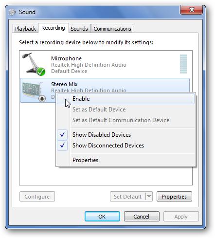 Faites un clic droit sur Stereo Mix (« Mixage stéréo ») désactivé, sélectionnez Enable (« Activer ») pour activer le périphérique. Weeny Free Audio Recorder pourra alors enregistrer à partir de la carte son. Définissez le mixage stéréo comme périphérique par défaut.