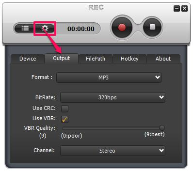 Ouvrez Weeny Free Audio Recorder, cliquez sur l'icône des paramètres et sélectionnez Output (« Sortie »). Vous pouvez choisir le format de sortie comme MP3, WMA, WAVE ou OGG. Le débit binaire et la qualité peuvent également être ajustés.