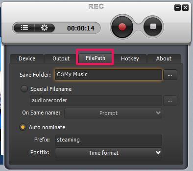 Accédez ensuite à l'élément FilePath (« Chemin du fichier ») et sélectionnez un dossier local pour enregistrer votre musique. Vous pouvez modifier la fonction de dénomination automatique au besoin. Weeny Free Audio Recorder vous permet d'utiliser des touches de raccourci pour un meilleur contrôle de l'ensemble du processus, et vous pouvez sélectionner les combinaisons de raccourcis clavier pour les actions de démarrage, de pause ou d'arrêt à partir d'une liste prédéfinie.