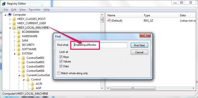 Accédez à HKEY_LOCAL_MACHINE \ SYSTEM \ CurrentControlSet \ Control \ Class \ {4D36E96C-E325-11CE-BFC1-08002BE10318} \ 0005 \ Settings \ filter \ Rear, ou recherchez « EnableInputMonitor » sous le dossier.