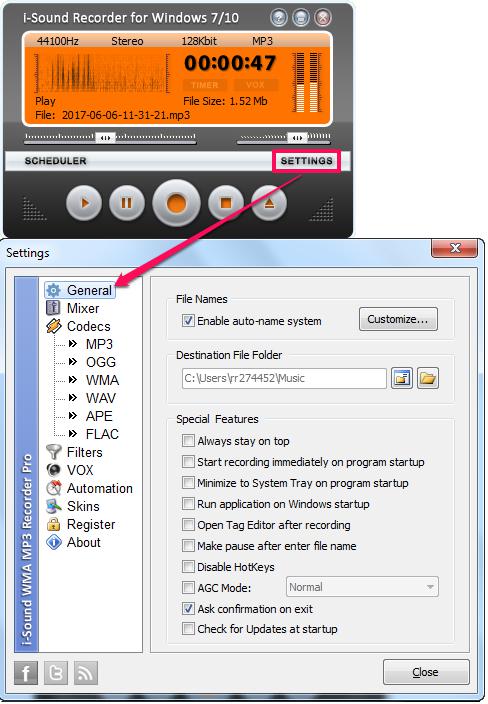 Ouvrez i-Sound Recorder, cliquez sur le bouton Settings (« Paramètres ») à droite pour ouvrir le panneau des paramètres. Sélectionnez General (« Général ») et vous pouvez spécifier le dossier de sortie et personnaliser sa fonction de dénomination automatique. Il peut être nommé comme date et heure d'enregistrement.