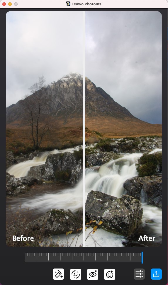Il y a une barre de réglage d’effet juste en dessous de la prévisualisation, qui vous permet d’ajuster les degrés de retouche IA de la photo. En déplaçant le curseur vers la droite, l’effet de retouche IA de la photo sera beaucoup plus évident. En plaçant le curseur à l’extrémité droite, vous obtiendrez la retouche IA maximale de la photo. Vous pouvez facilement appliquer l’ajustement à une seule photo.
