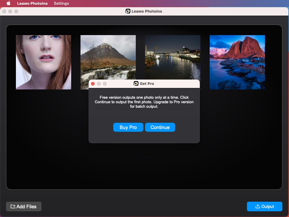 Si vous utilisez la version d’essai gratuit, il apparaîtra une fenêtre de notification « Obtenir Pro » qui vous montrera la limitation de la version d’essai gratuit et vous offrira les options « Acheter Pro » et « Continuer ». Vous pouvez cliquer sur l’option « Acheter Pro » pour acheter la version Pro et vous inscrire à PhotoIns de Leawo pour Mac en vue de profiter de toutes ses fonctionnalités, ou cliquer sur le bouton « Continuer » pour continuer la version d’essai gratuit.