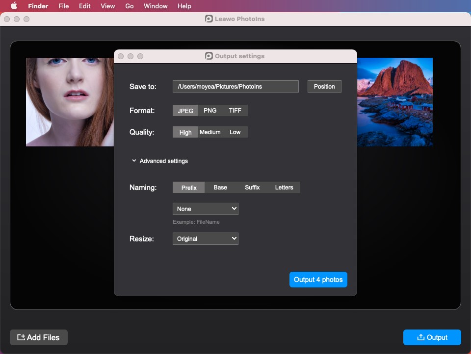 Remarque : PhotoIns de Leawo pour Mac prend en charge les fichiers RAW, JPEG, TIFF et PNG d’au moins 800 x 600 pixels.