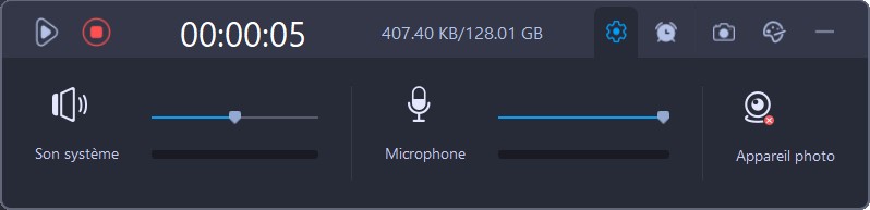 Si vous voulez activer ou désactiver « Son système » ou « Microphone » pendant le processus d’enregistrement de la webcam, cliquez sur le bouton Paramètres , puis sur l’icône de chaque fonction pour activer ou désactiver la fonction correspondante.