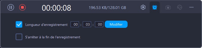 Pour planifier le processus d’enregistrement, cliquez sur le bouton en forme d’horloge dans la barre de menu supérieure, et cochez la case située devant « Longueur de l’enregistrement ». Ensuite, entrez l’heure dans les cases, ou entrez l’heure en cliquant sur le bouton « Modifier »