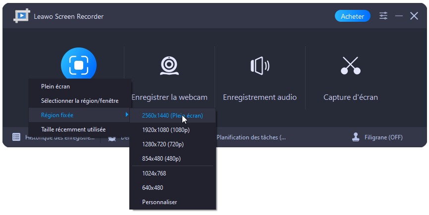 Une fois que vous cliquez sur le bouton « Enregistrer l’écran » sur l’interface principale, il apparaîtra un menu déroulant, dans lequel vous pouvez sélectionner la zone d’enregistrement parmi Plein écran, Sélectionner la zone/fenêtre, Région fixée ou Taille récemment utilisée.