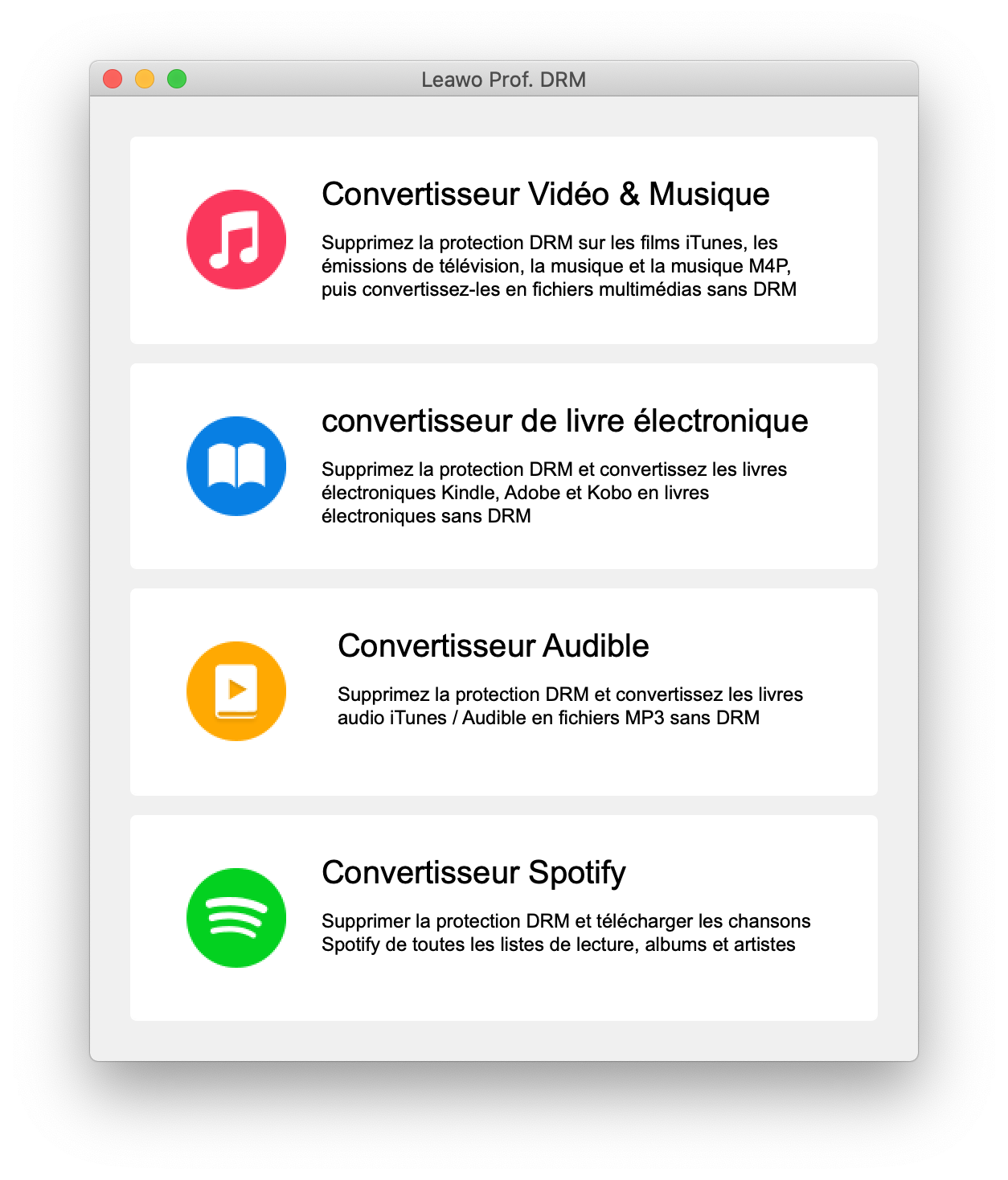 En tant que l’application la plus professionnelle de la suppression de protection GDN de différents types, Leawo Pro. DRM pour Mac se compose d’un convertisseur de vidéo, d'un convertisseur de musique, d’un convertisseur de livre audio, d’un convertisseur de livre numérique et d’un convertisseur de musique de Spotify. Comme ce que montre le titre de l’application, Prof. DRM de Leawo pour Mac peut décrypter la protection GDN des fichiers d’iTunes, des livres numériques, de la musique de Spotify, et les convertir aux formats universels. En bref, ce produit polyvalent vous libère des contraintes de GDN qui vous empêche à lire ou transférer les fichiers sur des autres appareils.