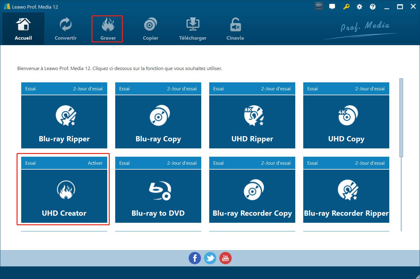 Lancez Prof. Media de Leawo. Cliquez sur le bouton « Graver » dans la barre de menu ou sur l'option « Créateur UHD » au milieu pour entrer dans le module Créateur UHD.