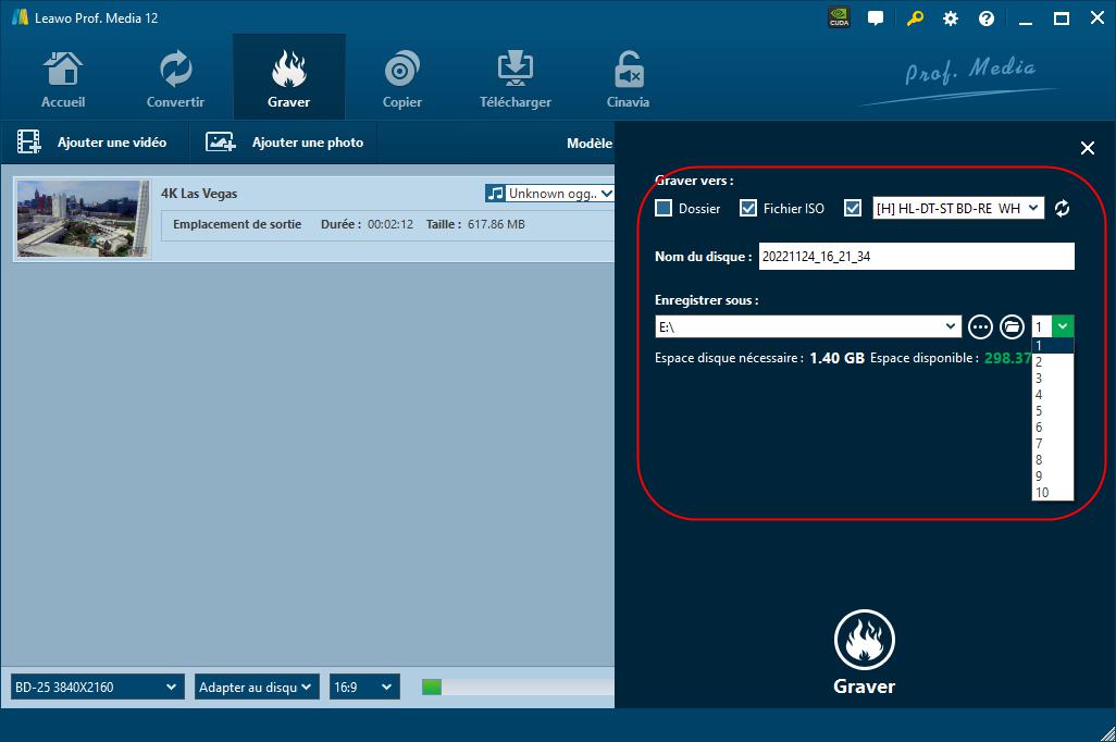 Juste à côté de l'icône du dossier , vous pouvez voir un bouton déroulant cliquable, qui vous permet de décider du nombre de copies de disques Blu-ray 4K que vous souhaitez créer. Cette option est uniquement disponible lorsque vous avez choisi de créer un disque Blu-ray 4K dans la section « Graver sur ».