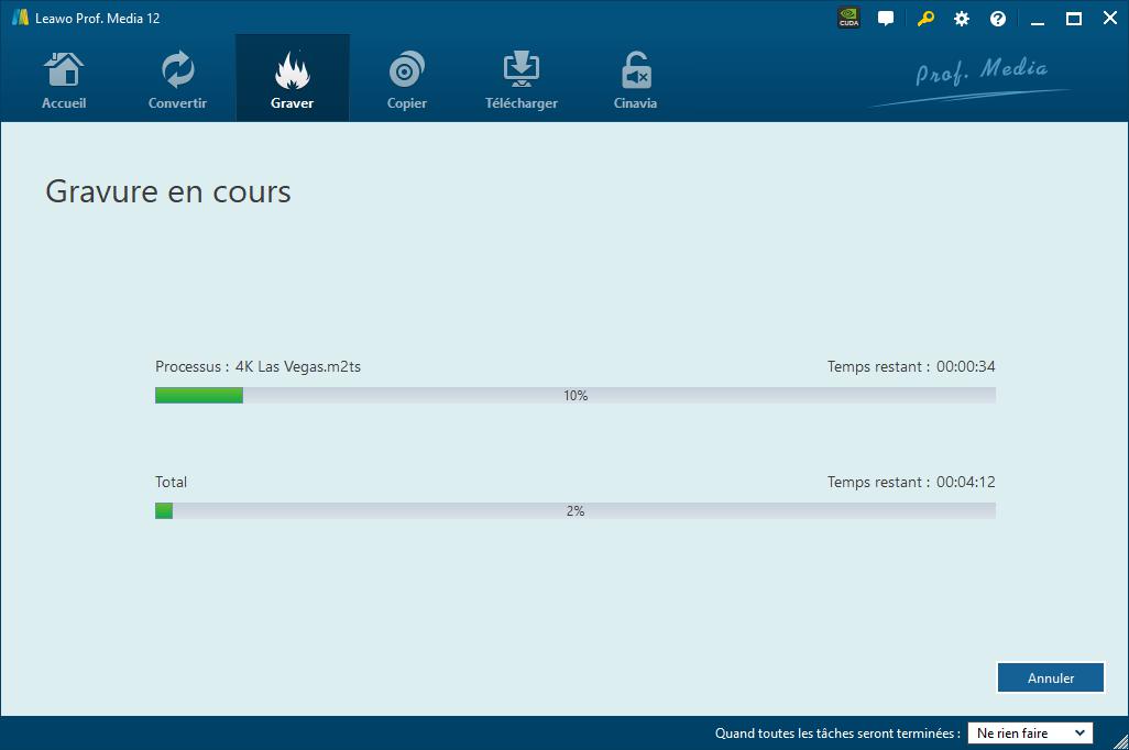 Enfin, cliquez sur le bouton « Graver » en bas de la barre latérale pour commencer à graver les vidéos sur 4K Blu-ray 4K dans le Créateur UHD de Leawo. Sur l'interface « Gravure », vous pouvez visualiser l'intégralité du processus de gravure et définir l'opération après la fin du processus dans le coin en bas à droite.