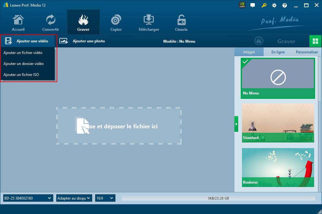 Dans le module « Graver », cliquez sur le bouton déroulant « Ajouter une vidéo », puis choisissez l'option « Ajouter une vidéo », « Ajouter un dossier vidéo » ou « Ajouter un fichier ISO » pour charger les fichiers sources correspondants.