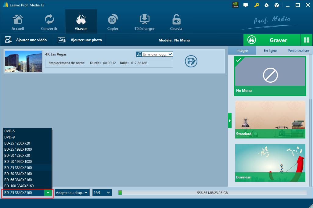 Remarque : Pour graver un Blu-ray 4K, dans le coin en bas à gauche, cliquez sur le premier bouton déroulant, puis choisissez l'une des options BD-25 3840X2160, BD-50 3840X2160, BD-66 3840X2160 et BD-100 3840X2160 en fonction du type du disque Blu-ray 4K que vous souhaitez créer. Définissez ensuite l'option « Adapter au disque » et le rapport hauteur/largeur. Vous pouvez également voir l'espace requis en bas de l'écran.