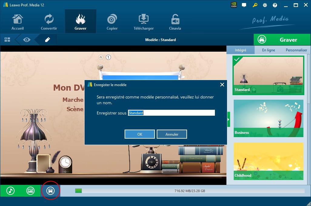En cliquant sur l'icône en forme de crayon, vous pouvez accéder à la page de conception de menu du disque pour concevoir un menu du disque selon votre propre volonté, comme changer le titre, ajuster la police/taille/couleur du texte, ajouter une image/vidéo d'arrière-plan ou de la musique de fond, changer l'ordre de la liste des chapitres, etc. Une fois ces paramètres définis, vous pouvez cliquer sur le bouton « Enregistrer le modèle » afin d’enregistrer le menu du disque conçu comme un nouveau modèle sous l'onglet « Personnaliser » pour une utilisation ultérieure.