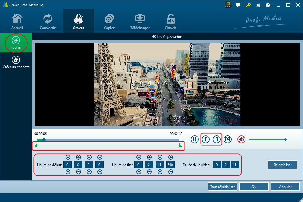 Sous l'onglet « Rogner », vous pouvez couper la longueur de la vidéo afin de supprimer les clips indésirables pour la conversion. Il y a 3 façons de couper la longueur de la vidéo :