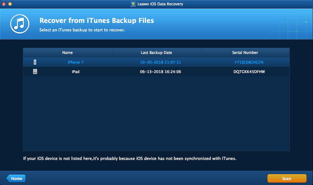The backups in your iTunes will be shown in the window. Select a backup and click "Scan"