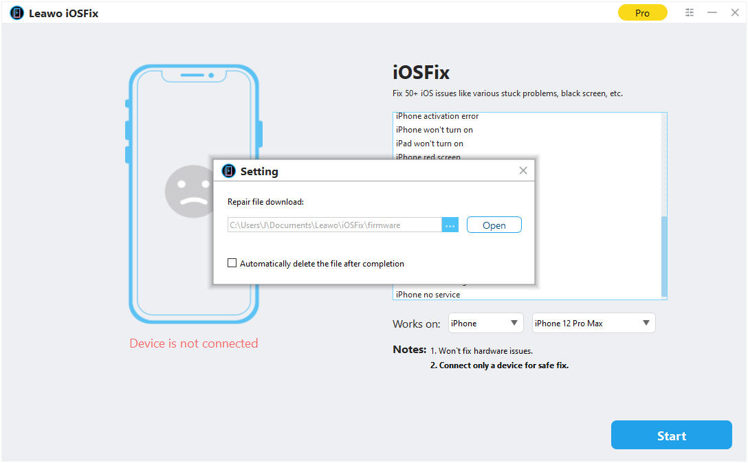 Click "Settings" button in the three-dot icon on the top-right corner, and then navigate to "Setting" option. Click on the "Setting" option, and there will pop up a "Setting" panel where you can set directory for downloaded firmware. Click the three-point icon or "Open" button to browse and choose a directory for saving downloaded firmware in the "Repair file download" box. You can also tick on "Automatically delete the file after completion" to let this iOS repair tool automatically delete the downloaded firmware after repairing your iDevices to keep your computer tidy.