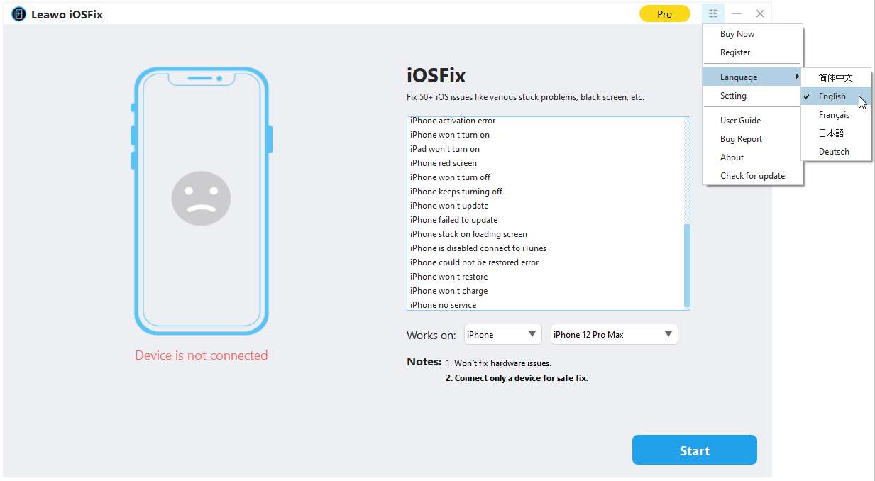 Once you have launched Leawo iOSFix on your computer, click "Settings" button in the three-dot icon on the top-right corner, and then navigate to "Language" option. The multiple UI language panel will pop up with several options: Simplified Chinese, English, French, Japanese and German. Choose preferred language to set program UI language for this iOS repair tool.