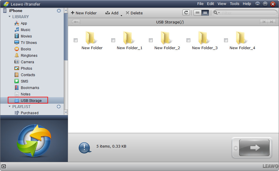 Run Leawo iTransfer and connect iPhone to computer with the USB cable. The software will recognize and detect your iPhone. Click the name of iPhone and find USB Storage in the left sidebar.