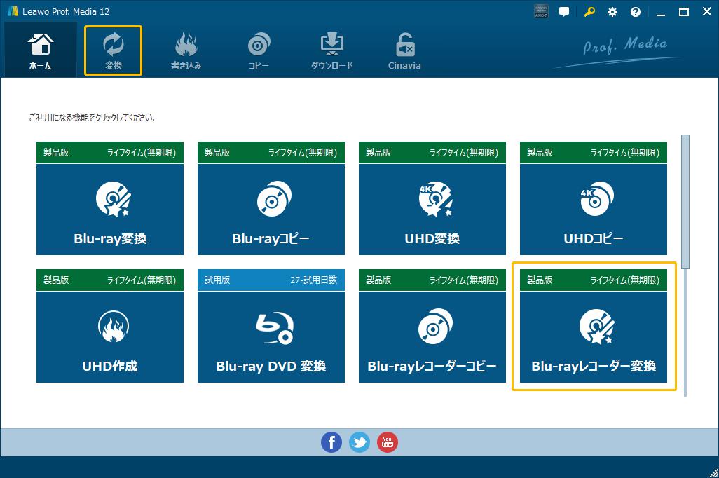 Leawo Prof. Media 13を起動して、ホーム画面にある「Blu-rayレコーダー変換」タブをクリックすると、Blu-ray変換のモジュールを起動します。または上の機能モジュールにある「変換」アイコンをクリックします。