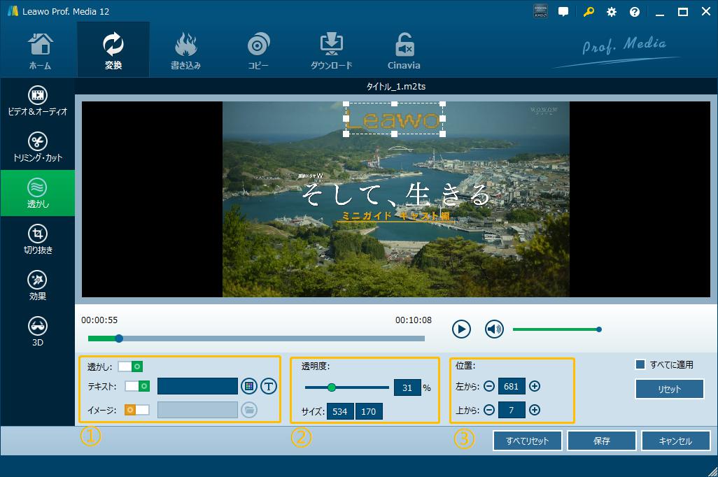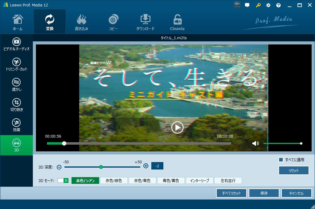 もっとBDAVファイルを楽しめるために、Leawo Blu-rayレコーダー変換は実用で使いやすい動画編集機能を内蔵し、ビデオ&オーディオ編集、トリミング・カット、画像やテキスト透かしの追加、画面サイズの調整、ビデオエフェクトの調整、3D動画に変換など、追加したBDAV動画を簡単に編集することができます。