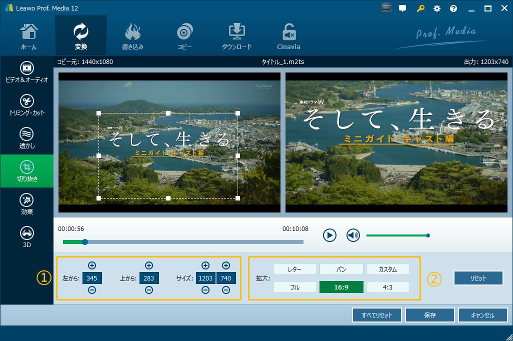 拡大:切り抜き枠の形状が設定できます。4:3比率の動画を16:9比率に変更できます。