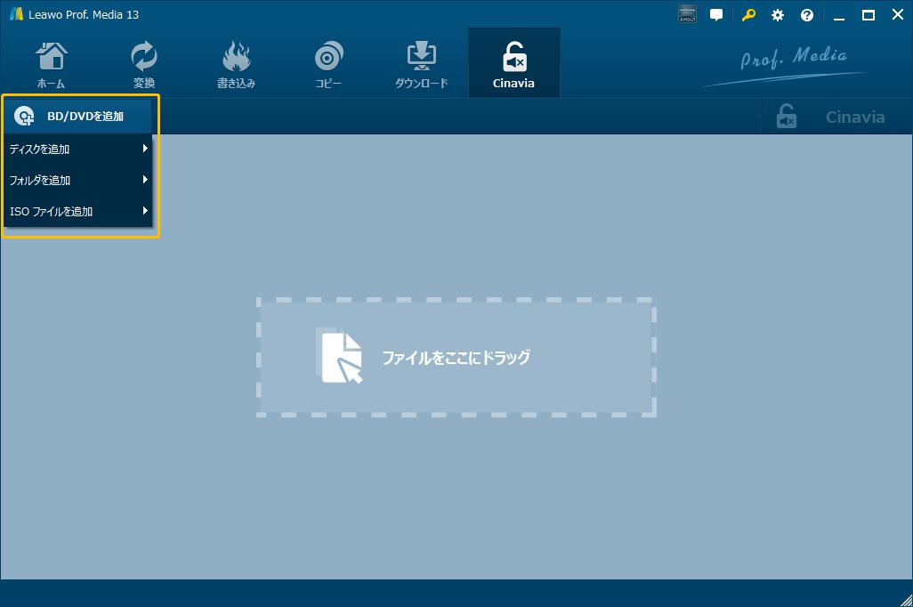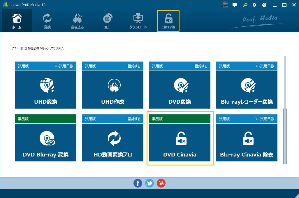 Leawo Prof. Media 13を起動して、ホーム画面にある「DVD Cinavia除去」タブをクリックすると、DVDブルーレイ変換のモジュールを起動します。または上の機能タブにある「Cinavia」アイコンをクリックします。