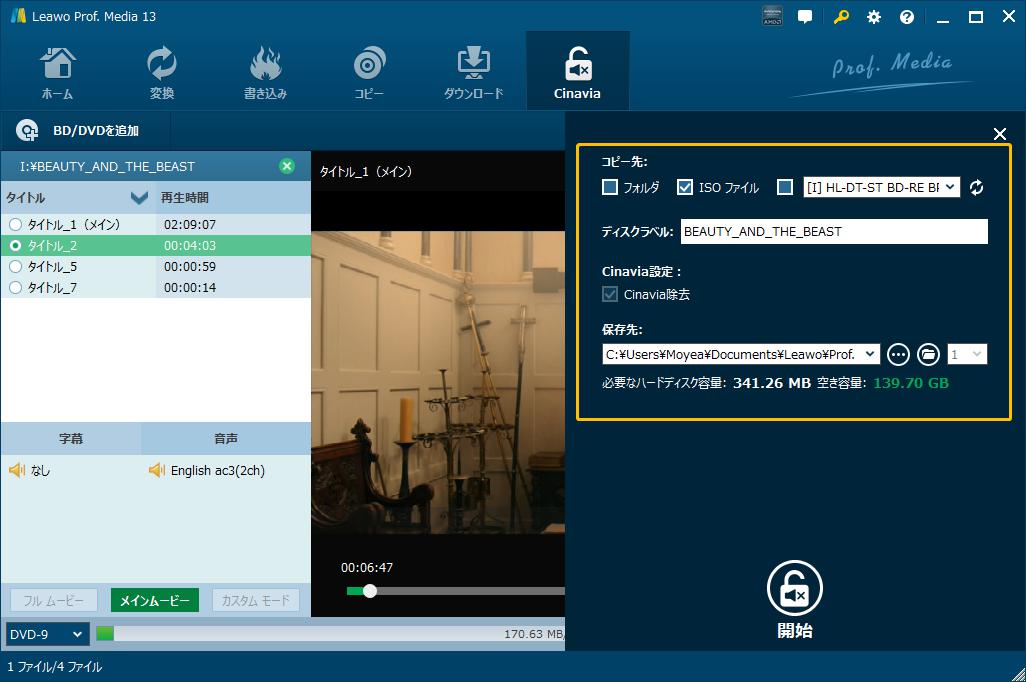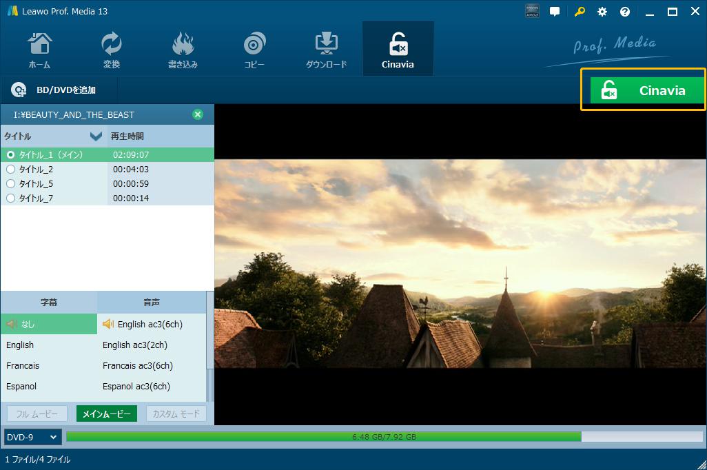ソースDVDディスクを読み込み完了後、すべてのタイトル、字幕と音声を一目瞭然で表示し、出力ファイルのプレビュー再生することができます。Leawo DVD Cinavia除去では、「メインムービー」というコピーモードで、CinaviaかかっているDVDをコピーすることができます。