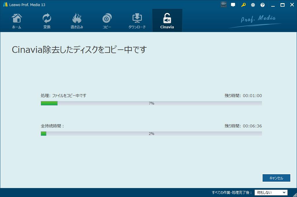 すべての設定が完了した後、サイドバーの下部にある「開始」ボタンをクリックすれば、DVD Cinavia除去プロセスを開始します。その後、状態パネルが表示され、作業の進行状況を確認できます。プロセスはいつでもキャンセル/停止可能で、右下隅で作業完了後の設定も変更できます。