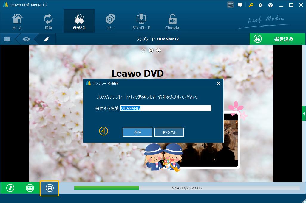 ディスクのイラストボタンをクリックすると、編集したテンプレートを保存します。保存したテンプレートは「カスタム」テンプレートに集まって、再利用が可能です。