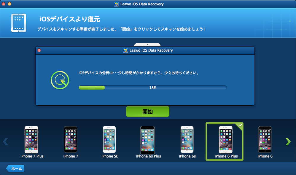 「復元開始」ボタンをクリックすると、iOSデバイスの分析が開始します。