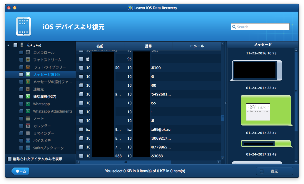 分析が完了した後、プレビュー画面が出てきます。 iOSデバイス内のカテゴリが左のサイドバーに表示され、内容のないものは灰色になります。特定のカテゴリ又は特定のファイルをクリックしてから、右下にある「復元開始」ボタンをクリックしてください。
