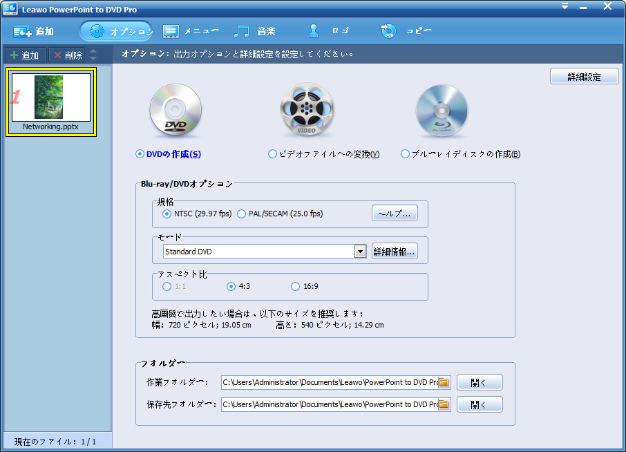 ブルーレイ/ DVDスライドショーをカスタマイズするには、「詳細設定」をクリックしてください。詳細設定画面でPowerPointプレゼンテーションファイルのオーディオステータス、スライドのサイズ、ビデオ品質、オーディオコーデック、ブルーレイ/ DVD言語コード、ブルーレイ/ DVDメニューのパラメータ、および変換設定を調整することができます。